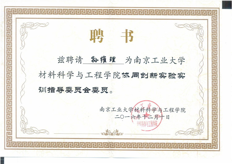 孫維理董事長榮獲南京工業(yè)大學(xué)材料科學(xué)與工程學(xué)院授予的“協(xié)同創(chuàng)新實(shí)驗(yàn)實(shí)訓(xùn)指導(dǎo)委員會(huì)委員”。
