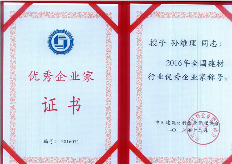 孫維理董事長榮獲中國建筑材料企業(yè)管理協(xié)會(huì)頒發(fā)的“2016年全國建材行業(yè)優(yōu)秀企業(yè)家稱號(hào)”。