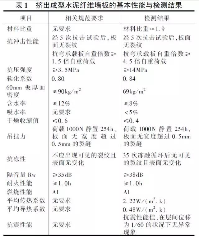 由福泰高科環(huán)保科技(上海)有限公司提供的復合墻板相關檢測報告表明,擠出成型水泥纖維墻板完全滿足鋼結構住宅對維護墻板高強、輕質、具有良好的保溫隔熱、隔聲、防水、防火、抗裂和耐候等綜合性能的要求,表1為擠出成型水泥纖維墻板的基本性能與檢測結果與《建筑隔墻用輕質條板》JGJ/T169-2005、《建筑用輕質隔墻條板》GB/T23451-2009、《建筑材料及制品燃燒性能分級》GB86242006等相關規(guī)范要求指標對比結果。